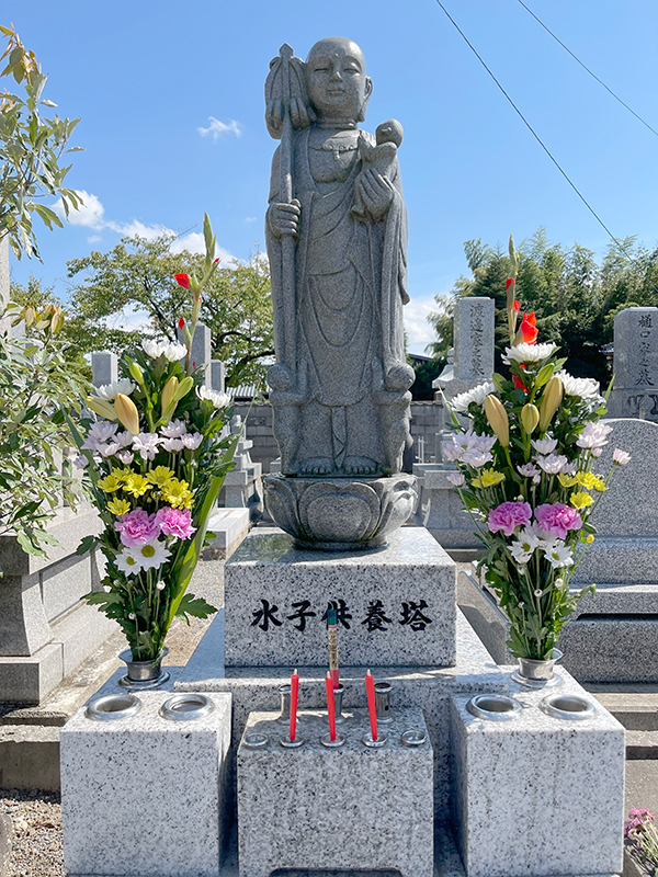 宝泉寺本堂にて赤ちゃんを抱いたお地蔵様「水子地蔵」を須弥壇に祀り供養した後、宝泉寺境内の水子供養塔にエコー写真を納め(ご希望の方のみ)読経いたします。